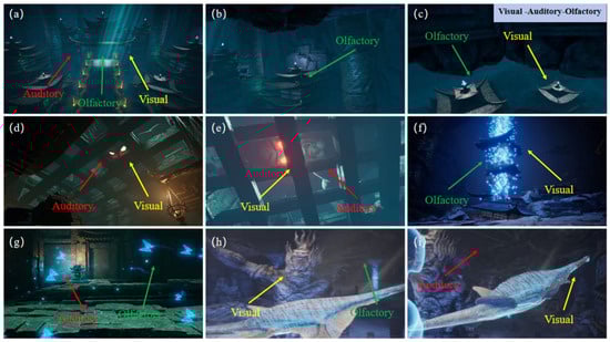 Example of Scene 3—Nine-panel diagram of a dungeon. Subfigures (a–i) depict different virtual scenes from a dungeon environment. All scenes fall within the visual–auditory–olfactory category.
