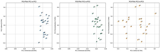 Through principal component analysis, three main components were identified: “immersive experience”, “cultural experience”, and “personalized experience.” These form the core framework of multisensory interaction experiences in digital museums. The “immersive experience” dimension encompasses the immersive sense created by the environment, the immersive nature of the interaction process, and emotional resonance and immersion. The “cultural experience” dimension focuses on visitors’ cultural cognition, cultural participation, and cultural internalization processes. The “personalized experience” dimension emphasizes users’ autonomy, content relevance, and sense of participation during the experience. This dimensional classification reveals the structural characteristics of multisensory interactive experiences and provides a theoretical foundation for subsequent design optimization.