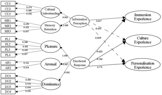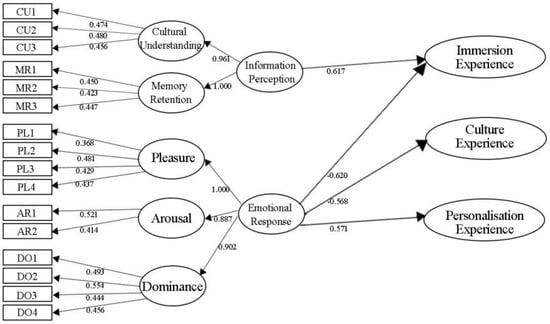 The measurement methods employed in this study were adapted from those previously described in the literature. The 11-item emotional response scale was adapted from the previous research literature [], including the study by Russell (1980) [], who proposed three basic dimensions of emotional states: pleasure, arousal, and dominance (PAD) []. In particular, the following combinations are illustrated: “annoyed-happy”, “unhappy-happy”, “dissatisfied-satisfied”, “desperate-hopeful”, “depressed-cheerful”, and “calm-excited.” The six-item information perception scale [] includes the item “Using immersive technology when visiting a museum will facilitate my comprehension of the museum.” The eight-dimensional environmental experience encompasses educational experiences, entertainment experiences, aesthetic experiences, experiences of escape, accidental experiences, local experiences, community experiences, and personalized experiences. The scale is employed for the purpose of evaluating the digital museum audience experience. All of the aforementioned items were measured using a 5-point Likert scale. (1 = completely disagree, 5 = completely agree)