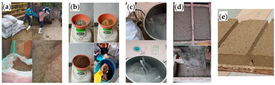 (a) Material processing (grinding and sieving), (b) measuring the ingredients, (c) mixing of dry and wet components, (d) layer compaction and casting, and (e) sun drying of molded bricks.