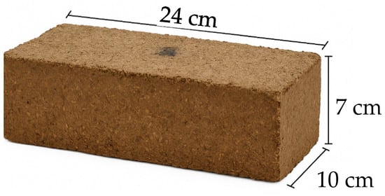 The manufacturing process involved five key steps, namely the collection of materials, preparation and sieving, homogenization, molding, and sun drying. Each mixture was blended with 390 g of water and compacted into layers to avoid porosity and ensure uniformity. The final brick dimensions were 24 cm × 10 cm × 7 cm (see Figure 4). Compacting pressure, layer thickness, and curing time were optimized based on mechanical performance.