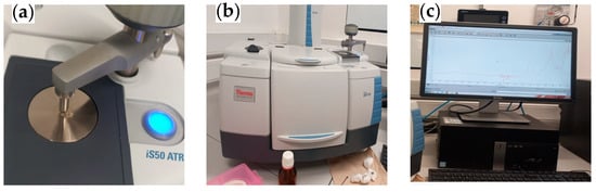 Equipment used for the FITR test. (a) Placing the sample in the reader, (b) starting the FTIR analysis, and (c) analysis results.