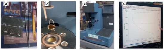 Procedure used for the TGA test. (a) Sample preparation, (b) sample placement in the crucible, (c) beginning of analysis, and (d) results analysis.