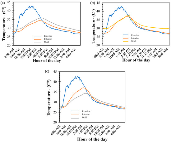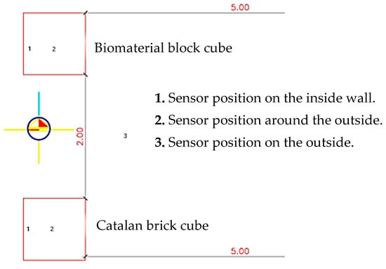 Two sensors were installed inside each module to measure dry-bulb temperature and relative humidity. Measurements were taken every 5 min for one week to collect real data that could be averaged and compared to identify trends in the thermal behavior inside the constructed modules. A third external sensor complemented this information to measure dry temperature and relative humidity.
