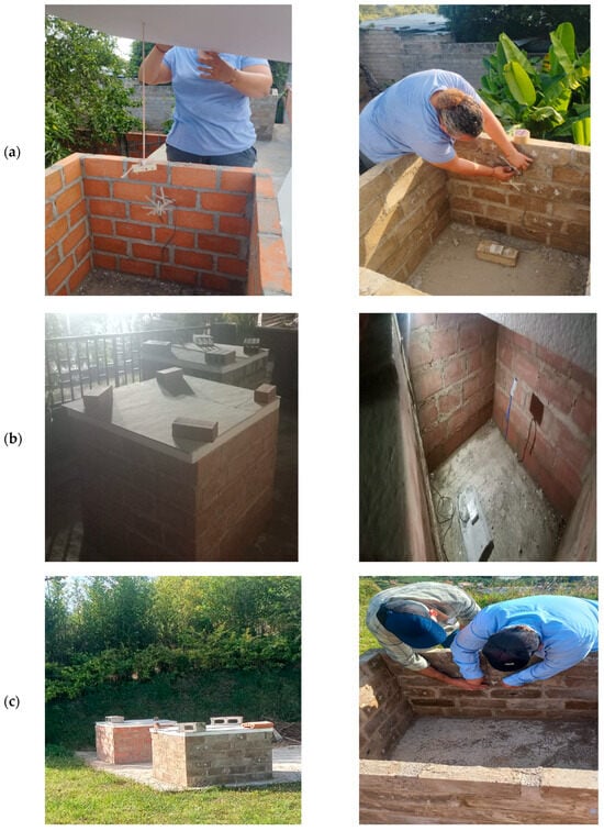 Two free-standing cubic modules of 1.0 m3 were built for this analysis with walls (dividing elements). The first was constructed with biomaterial blocks, and the second was made of Catalan brick. Both modules had an 8.0 cm-thick expanded polystyrene (EPS) roof slab. They were placed in a location where direct solar radiation in the afternoon would strike the reference wall directly, in the municipalities of Aguachica, Bello, and El Peñol—each at different altitudes above sea level and representing different climatic conditions, namely hot and humid (Aguachica), temperate (Bello), and cold (El Peñol), as shown in Figure 8 and Figure 9.
