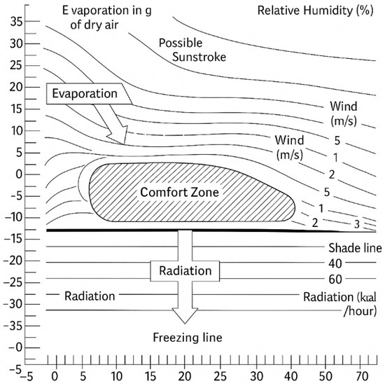- Comfort zone: A shaded area in the center representing the optimal combination of temperature, humidity, and wind speed for moderate activity levels.