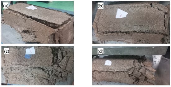A step-by-step process was followed for homogenization and compaction. The materials were mixed with 390 g of water and compacted in successive layers to minimize porosity and ensure structural integrity. The production of bio-bricks involved several carefully controlled steps, as shown in Figure 3. These steps were as follows: