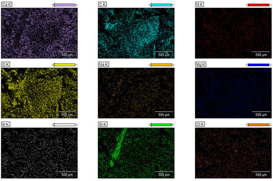 The microstructural and elemental characterization of the bio-brick composite was carried out using scanning electron microscopy coupled with energy-dispersive X-ray spectroscopy (SEM-EDS). Micrographs of the mixture were obtained using a JEOL JCM-6000 operating at 15 kV with an Ultradry EDS detector, as is shown in Figure 5. Samples were gold-coated before analysis to ensure surface conductivity [39,40].