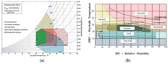 (a) Givoni’s bioclimatic chart, and (b) Olgyay’s bioclimatic chart. Source: Obtained from [74,75].