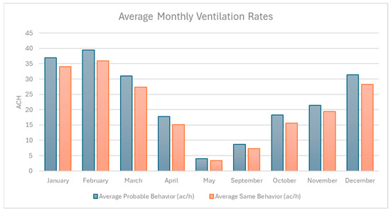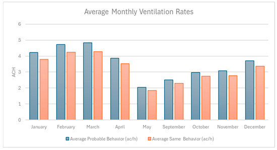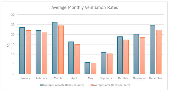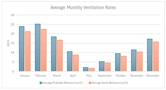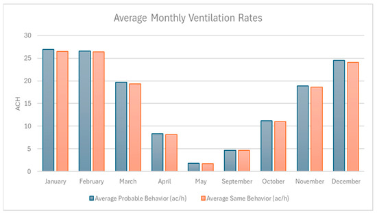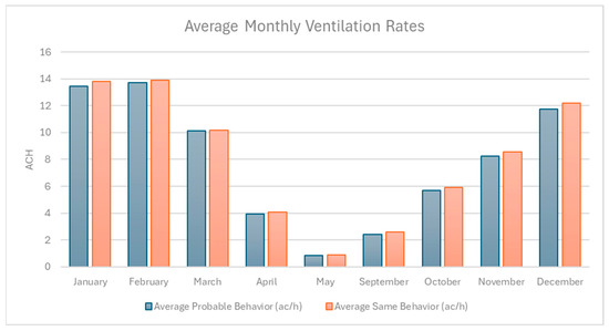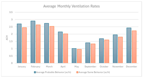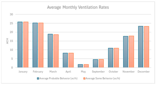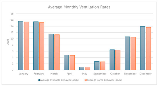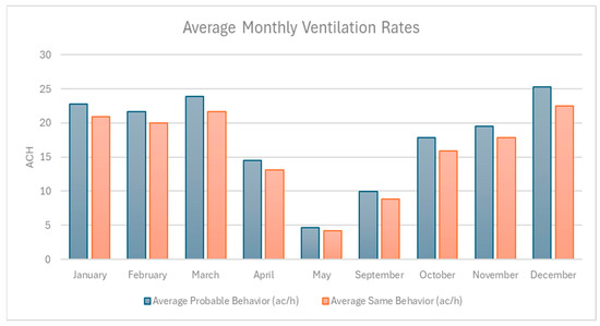 Figure 6 shows the average monthly ventilation rates (ACH) under SB and PV scenarios, highlighting consistently higher airflow under PB during transitional months such as April, May, September, and October, while ventilation rates are nearly identical during the summer months (January–February) when environmental conditions strongly drive window use. This pattern emphasizes the influence of adaptive occupant behavior in enhancing natural ventilation during milder periods when passive airflow might otherwise be limited.