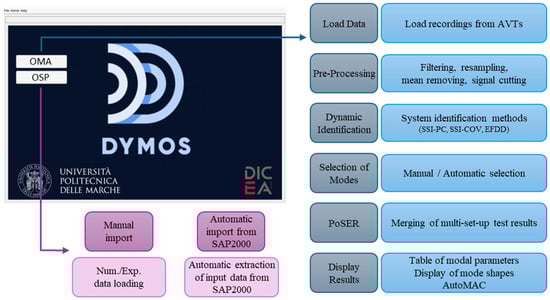 DYMOS is a software developed in MATLAB environment that is suitable for the comprehensive dynamic identification of structures. To the best of the authors’ knowledge, it is the first software containing the following two main parts (Figure 1): one to perform the OMA, while another to perform the OSP. These two tasks are closely interconnected, as the OSP is a fundamental component for conducting accurate AVTs and the corresponding OMA. In the first part (OMA), a user may find modules for pre-processing of the original data, modal identification, mode selection, merging data from several AVT configurations, and graphical representation of results. The second part (OSP) consists of two modules that differ in how input data is provided. The first module requires manual input, making it compatible with both numerical models and experimental results. The second module automatically loads data from a commercial software (SAP2000), limiting its use to numerical applications.