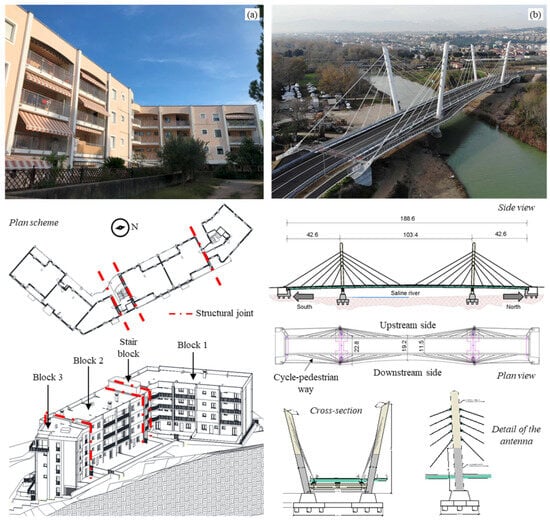 Case studies adopted for the DYMOS software testing and validation: (a) 4-block building; (b) cable-stayed bridge.