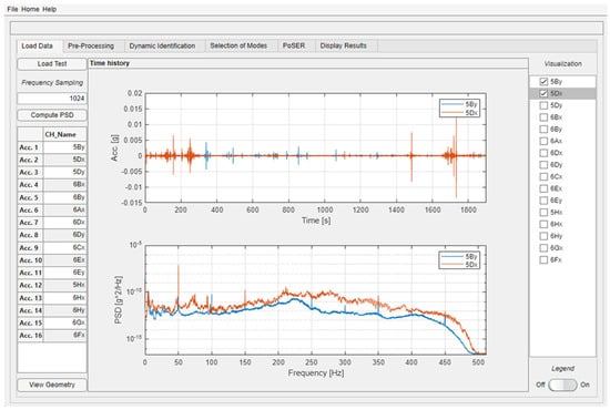 The first module of the software (“Load Data”) allows for the loading of signals recorded during dynamic tests with the aim of checking their goodness and detecting any anomalies, also performed by visualizing the relevant spectrum (Figure 3). After selecting the file to be uploaded, the software automatically recognizes the number of columns within the file, which corresponds to the number of the recorded measurement channels (equal to the total number of measurement direction of all the sensors). The user may assign a customized name to each channel, which usually corresponds to the same name assigned at the dynamic test design stage. Then, the correctness of the channel name can be checked by means of the “View Geometry” button, which displays the complete geometry of the tested structure with indication of the direction and the name of each measurement channel. Details on how to create this geometry will be provided later in a dedicated section (Section 7). Another key parameter to be entered at this stage is the signal sampling frequency. By clicking on the “Compute PSD” button, the software allows the power spectral density (PSD) of each signal to be calculated and displayed up to the Nyquist frequency. By acting on the check boxes in the right-hand side menu, it is possible to select the channel to be displayed in the graphs, also being active the option of displaying several channels simultaneously and superimposed. An example of the use of this module and the display of signals and spectrum can be found in Figure 3 for recordings of a dynamic test performed on the building case study.