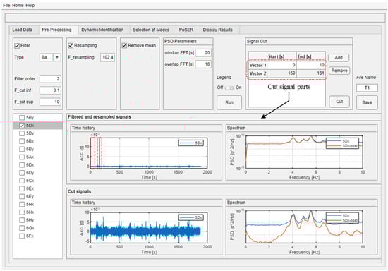 Signal pre-processing is a fundamental step before using measured data as it helps eliminate most noise effects and any abnormal events, ensuring that the processed signals comply with the white noise assumption. The “Pre-Processing” module of the software (Figure 4) allows the common pre-processing procedures to be performed both together and separately by activating the check box of the relevant procedure. The original signal can be filtered by using a Butterworth filter and selecting one of the three most common filter types (low, bandpass, and high). For both case studies, a bandpass filter is used, but with different cutting frequencies (F_cut): the interval 0.1–10 Hz is chosen for the building, while 0.1–2 Hz is chosen for the bridge, being the latter a more flexible structure. The down-sampling frequency could be set to reduce the amount of data and perform faster subsequent analyses. In both case studies, the adopted frequency sampling during the dynamic tests was 1024 Hz due to characteristics of the adopted instrumentation; consequently, a reduced amount of data is employed to perform the modal identification, choosing a re-sampling frequency of 102.4 Hz. Furthermore, linear detrending could be performed as well. Before running the aforementioned pre-processing techniques, parameters to compute the Welch’s PSD estimate have to be provided by the user; the authors suggest using 20 s for the signal windowing with 10 s of overlapping.