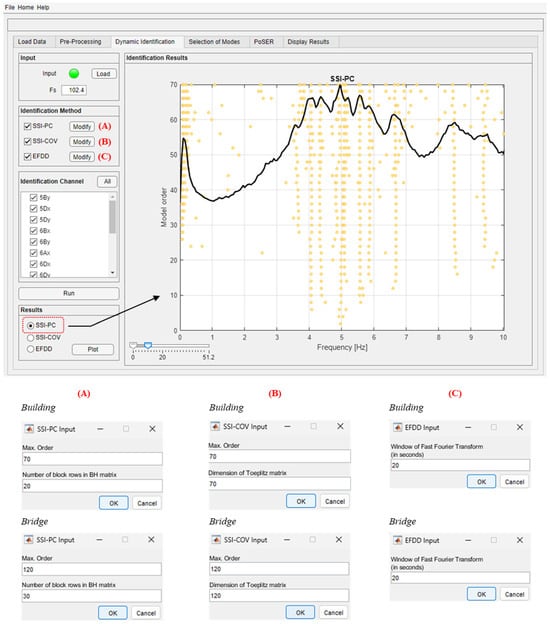 The “Dynamic Identification” module allows the system dynamic identification and the display of the relevant results to be performed. The methods implemented for the modal identification in the DYMOS software are well established and robust, allowing for the identification of a structural system regardless of the sensor layout used. This module makes it possible to operate in continuity with the previous pre-processing phases or to directly load a file collecting pre-processed recordings already available. Obviously, in both cases, the sampling frequency (Fs, original or re-sampled) must be entered. The three identification methods can be selected either individually or together and, when selecting one method, the input parameters must be inserted. In Figure 5, the parameters adopted for the dynamic identification of both case studies and for all three methods are reported. These parameters are obtained after several tests and are the ones that led to the most accurate modal identification.