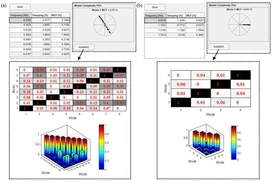 After the mode selection, the obtained results are reported in terms of modal parameters for each selected mode. More specifically, a table collecting frequency, damping ratio and modal complexity factor (MCF) values for each mode is reported, together with the modal complexity plot that varies selecting modes in the table. Also, the AutoMAC calculated between all the selected solutions is shown in the relevant AutoMAC matrices. The results can be saved in a dedicated .xlsx format file that collects the frequency, damping ratio, MCF, and modal displacement normalized with respect to the maximum value of each mode. As an example, the modal identification results for the two case studies are reported in Figure 6.