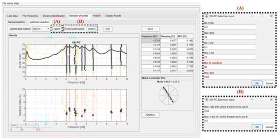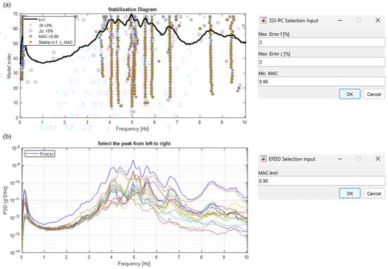 Considering time domain methods, these criteria are inherent to the variation of the modal parameters between solutions at successive model orders, and they are calculated between the poles of the stabilization diagram. In more detail, the maximum percentage variations in frequency and damping must be defined, as well as the minimum MAC threshold (defined between 0 and 1). From the authors’ experience, reasonable values to obtain a good mode selection could be set at 3% for frequency and damping differences, together with an MAC threshold of at least 0.95. For a clearer understanding, each of these criteria is represented by a different symbol in the representation of the stable pole in the stabilization diagram (cross, circle, and star); if all these conditions are satisfied, the stable pole is represented with an orange circle (Figure 7a), indicating a possible solution of the system. Poles that are not stable in any characteristic are not drawn. Solutions characterized by negative damping are automatically eliminated in the construction of the stabilization diagram as they are deemed to be unrealistic. A mode is manually selected by clicking in one of the solutions of a dot column, which is a candidate for a possible system solution. For the frequency domain method, only the MAC threshold must be defined. The relevant interactive window allows showing both the PSDs of all recordings and their first SV, as depicted in Figure 7b. Here, modes are selected by the peak-picking method.