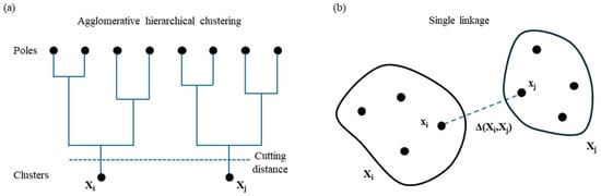 Next, mode selection is carried out to differentiate real modes from spurious ones. An effective approach to automate this step in OMA is to apply cluster analysis to the results of the stabilization diagram. Cluster analysis is a method that groups elements based on shared characteristics. In the context of stabilization diagram interpretation, it helps group identified modes with similar modal properties. The DYMOS software employs agglomerative hierarchical clustering (AHC) for this purpose. AHC starts by treating each data point as an individual cluster. At each subsequent step, the two closest clusters are merged to form a new, larger cluster. This iterative process continues, progressively reducing the number of clusters while increasing their size through successive aggregations. A schematization of the implemented clustering procedure with the hierarchical tree is represented in Figure 8a. When using a hierarchical agglomerative clustering algorithm, it is essential to define two quantities: distance and linkage. The calculation of the distance between the modal parameters of two poles i and j of the stabilization diagram can be carried out using the following formulas []:
