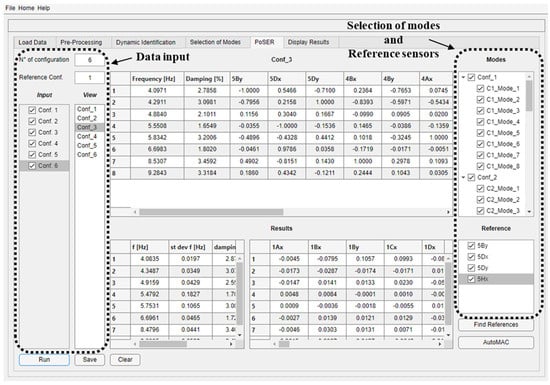 The “PoSER” module of the software (Figure 10) requires loading multiple modal identification results in a predefined format, which matches the format used for saving results in the “Selection of modes” module. Once all configurations are loaded, it is possible to select via a check box on the right-hand side the modes to be considered for each of them, and that must be common to all configurations. The software automatically recognizes the sensors common to all the configurations, i.e., those used as a reference. In addition, it is possible to use a reduced number of reference sensors by simply selecting via check boxes those that are deemed necessary. At the end of the procedure, a table collecting the scaled mode shape displacements can be saved as an .xlsx format file.