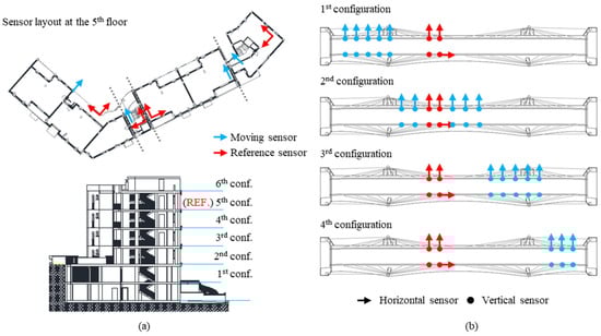 To dynamically test both case studies, many sensor configurations (and non-contemporary AVTs) were performed due to the size and complexity of the structures. Reference sensors were always left in the same positions (highlighted in red in Figure 11). For the building case study, six sensor configurations were adopted, as shown in Figure 11a. The same sensor layout was used for all the six floors: for each block, three sensors per floor were used because the in-plane rigid assumption of floors was assumed realistic. Moreover, two sensors per block located at the fifth level were used as a reference. Considering the bridge, three sensors per cross-section were employed to capture the displacement components of bending, torsional, and transverse modes of the deck (Figure 11b). All cross-sections where stay cables are connected to the deck were measured in order to obtain refined modal deformations. Four sensor configurations were necessary to test the whole bridge, and for all of them, two cross-sections approximatively at the mid-length of the bridge were left as a reference. Additionally, in one of these reference sections, a further sensor was positioned, measuring in the longitudinal direction.
