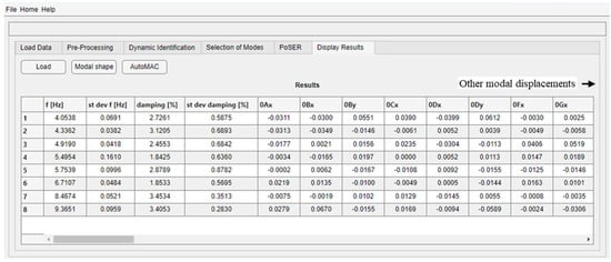 The “Display Results” module is one of the strengths of DYMOS software as it has the great advantage of using CAD drawings (i.e., files in .dxf format) as geometry input data, making the construction of the geometric model and measurement grid much simpler, faster, and intuitive, thus guaranteeing a simple yet detailed visualization of mode shapes. At the beginning, the loading of modal parameters saved either at the end of the mode selection procedure (in case of a single test configuration) or after the PoSER execution is required. A table summarizing the identified modal parameters is shown (Figure 12), which, in the case of PoSER results, contains the average values of frequencies and damping ratios values of the different modes among all configurations, their standard deviation to quantify the scattering of these modal parameters during the whole test period (“st. dev. f” and “st. dev. damping”), and all the modal displacements of all sensors correctly scaled. The variations of modal parameters of different configurations could be due to the uncertainty in the adopted identification method as well as due to the influence of environmental (e.g., temperature) and operational factors (e.g., anthropic activities within or close to the structure) that may vary during the test operations. Then, the loading of the geometric model of the structure is required as well. After that, the mode shapes are plotted thanks to an interactive window that allows the selection of the mode to be displayed and allows for the definition of the mode shape scaling factor. The geometrical CAD model must be differently created as a function of the tested structural typology. The software has implemented two tools suitable for buildings and bridges with all types of geometries.