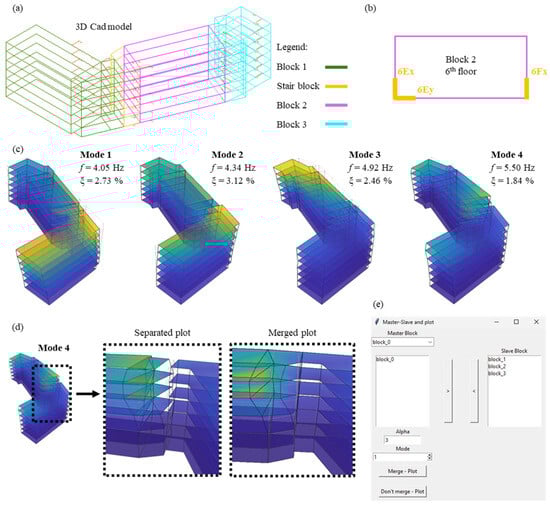 Tool to display the mode shapes of buildings: (a) initial 3D CAD model; (b) minimum sensor layout for each block; (c) visualization of the first 4 mode shapes for the building case study; (d) differences in the visualization of mode shapes (separated and merged plot); (e) interactive window for the mode shape plot of buildings.