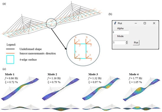 Tool to display mode shapes of bridges: (a) initial 3D CAD model; (b) interactive window for the mode shape plot of bridges; (c) visualization of the first 4 mode shapes for the bridge case study.
