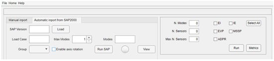 The second task of the software is dedicated to the OSP. To the best of the authors’ knowledge, it is the first time a OSP module has been integrated in an OMA software, improving its usability and usefulness. This module allows for the execution of OSP analyses, adopting as input either numerical or experimental data. The former can be obtained from a numerical model of the structure, while the latter from OMA. In both cases, the input (in terms of frequencies and modal displacements of selected/all joints) is provided by using standard .xlsx format files in which data must be prepared following a standard format and layout. In addition, numerical data can be directly loaded from the software if the CSI SAP2000 software [] is used. Indeed, a SAP-MATLAB toolbox [] is used to create this module that allows for communication with the finite element model (FEM) developed in SAP2000 and the DYMOS software. Only a brief description of the OSP module is given in this manuscript (Figure 15) as this is an up-to-date version of the MATLAB software presented in the work of Nicoletti et al. [], where the reader may find all the relevant details. Moreover, this paper does not provide a detailed discussion of the adopted OSP methods and their potential and limitations in structural engineering applications, as this topic is addressed in another work already published by the authors []. In this work, the use of this module is described with reference to the two case studies.