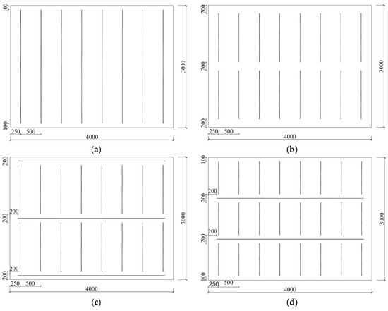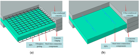 In this study, two types of wall panels were designed: the Grid-Fiber Concrete Sandwich Panel (G-FCSP), which is reinforced with glass fiber grids, and the Fiber Concrete Sandwich Panel (FCSP), which is not reinforced with steel mesh. For ease of comparison, both wall panels have dimensions of 4000 mm × 3000 mm × 150 mm. The mesh size of the glass fiber grid is 25.4 mm × 25.4 mm. According to the standard “08SJ110-2 Precast Concrete Exterior Cladding Panels”, wall panels of this size are classified as full-bay panels based on architectural elevation division. This means that the wall panels are large enough to cover an entire bay without the need for multiple panel joints. Full-bay panels significantly reduce the amount of on-site assembly work and time required, effectively shortening the construction period. They also improve the working environment for construction workers and minimize the inconvenience during the construction process. With fewer joints, full-bay panels can effectively reduce the possibility of rainwater leakage through panel joints, while also reducing energy loss and enhancing the overall thermal insulation performance of the exterior envelope. A 20 mm thick concrete edge is provided along the height of the wall panel to protect the insulation layer. Polypropylene fiber-reinforced concrete wall panels indirectly reduce energy consumption by improving thermal insulation and airtightness, while their high thermal capacity and crack resistance contribute to a stable indoor environment, enhancing thermal comfort, The board is made of Extruded Polystyrene Foam (XPS) panels. The three-dimensional structures of the two types of wall panels are illustrated in Figure 1a and Figure 1b, respectively.