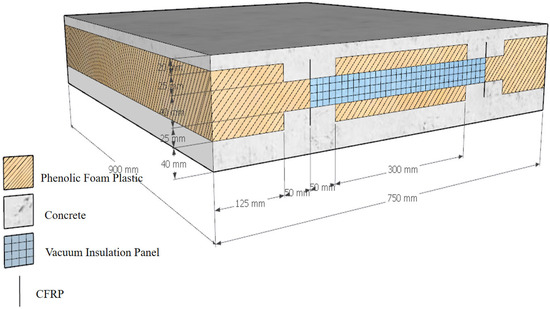 To ensure the accuracy of the thermal performance analysis of the two types of wall panels in this study, the experimental results from the literature “Thermal investigation of thin precast concrete sandwich panels” [26] were selected for validation. The corresponding finite element model was established to simulate and verify the results. The test specimen materials included concrete, phenolic foam, vacuum insulation panels (VIPs), and carbon fiber-reinforced resin material (CFRP) connectors with a lower thermal conductivity. The dimensions and specific construction details are shown in Figure 2.