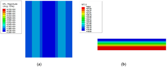 Model simulation results: (a) Heat flux distribution contour plot on wall panel; (b) temperature field contour plot through wall thickness.