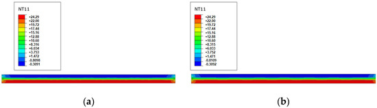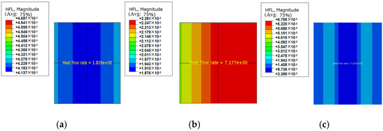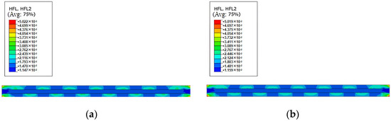 A finite element analysis model for the thermal performance of the sandwich wall panel was established based on the designed wall panel dimensions. The inner and outer surface temperatures of the wall panel, the temperature difference, and the average thermal transmittance coefficient of the wall panel, obtained from the simulation results and processed using Equation (3), are shown in Table 5. The thermal conductivity coefficients of the G-FCSP and FCSP wall panels were 0.768 W/m2 · K and 0.767 W/m2 · K, respectively, while the temperature differences between the hot and cold sides were 27.381 °C and 27.382 °C, with a difference of only 0.004%. The use of glass fiber grids improves the mechanical properties of fiber concrete sandwich wall panel without steel mesh to a certain extent, while having a negligible adverse effect on the thermal performance of the sandwich wall panel. This is because the thermal conductivity of glass fiber material is only 0.4 W/m2 · K, which is much lower than that of steel (58.2 W/m2 · K). Therefore, from the perspective of the thermal performance of the wall panel, the application of glass fiber grids in sandwich wall panels is feasible.