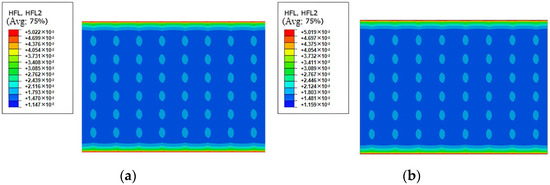 Heat flux density cloud of wallboard section: (a) thermal flux density contour map of the G-FCSP cross-section; (b) thermal flux density contour map of the FCSP cross-section.