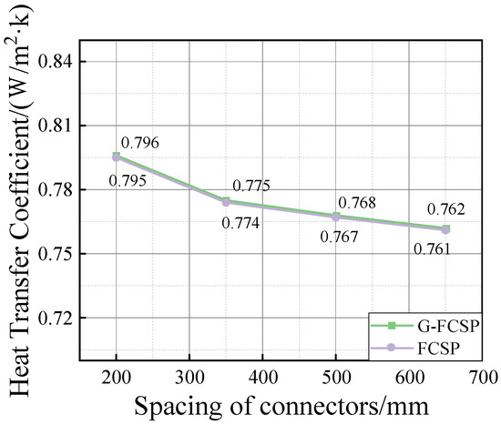 In the original model, the connector spacing was set at 500 mm. Additional thermal analysis models were established with reduced spacings of 350 mm and 200 mm, as well as an increased spacing of 650 mm. The simulation results for different connector spacings are presented in Table 8 and Figure 10. The results indicate that reducing the connector spacing has a certain adverse effect on the thermal performance of the wall panels. When the spacing is reduced to 200 mm, the thermal transmittance coefficients of both G-FCSP and FCSP increase by 3.64%. However, the ultimate load capacity of FCSP increases by 16.1%, and that of G-FCSP increases by 20.6%. When the connector spacing increased from 500 mm to 650 mm, the thermal transmittance (U-value) of both G-FCSP and FCSP decreased by 0.8%. These results indicate that expanding the connector spacing gradually reduces the wall panel’s U-value, albeit with diminishing effectiveness. Furthermore, the influence of connector spacing enlargement on the thermal performance of wall panels becomes progressively less significant. In contrast, when the thickness of the concrete inner and outer leaves is increased from 50 mm to 60 mm, the ultimate load capacity of G-FCSP increases by 26.5%, but this also leads to an approximate 20% increase in the weight of the wall panel. Although increasing the number of connectors does have some impact on the thermal performance of the wall panels, this impact is within an acceptable range. Therefore, when it is necessary to control the weight of the wall panels while enhancing their load-bearing capacity, reducing the connector spacing and increasing the number of connectors is a better option. Based on the above analysis, to balance mechanical load capacity and thermal damage mitigation, a spacing range of 200 mm to 500 mm is recommended for connector arrangement.