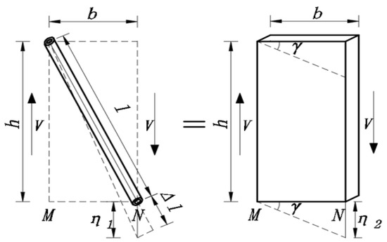 From Figure 2, it can be seen that the steel truss web bar is under the action of shear force . Assuming that the displacement of node with respect to node is , then is as follows.