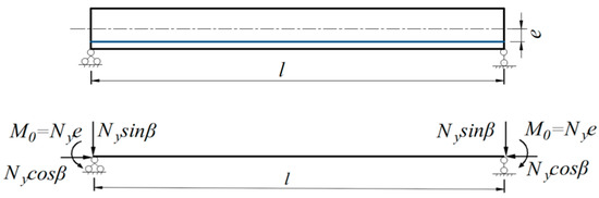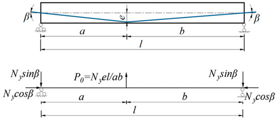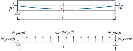 In the calculation of pre-stressed concrete structures, the equivalent load method proposed by R.B.B. Moorman converts the action of the pre-stressing tendons on the member at the anchorage end and in the span into equivalent loads [27]. The equivalent load at the anchorage end is decomposed into horizontal pre-axial force, vertical pre-shear force, and pre-bending force. The in-span equivalent load is determined by the shape of the mating bundle: a folded mating bundle is equivalent to a concentrated force, and a curved mating bundle is equivalent to a uniform load.