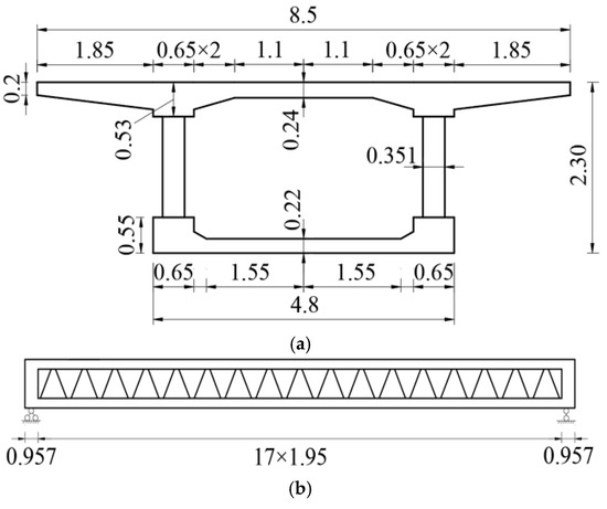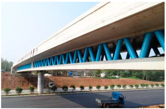 In this paper, the Jiangshan Bridge of the Nanjing Bypass Highway is taken as the engineering case study. Its superstructure adopts a two-span (35 m + 35 m), single-box, single-compartment, equal-section, steel truss web–pre-stressed concrete composite girder structure. The steel truss web is made of Q345C grade steel pipes, diagonally arranged, with a horizontal inclination angle of about 1.95 m and section spacing of 1.95 m [15]. The combined girder bridge combines in vivo and ex vivo pre-stressing beam deployment methods. The actual bridge of the project is shown in Figure 7, and one of the spans is selected as the simple supported system to be analyzed. The transverse and longitudinal structural dimensions are shown in Figure 8.