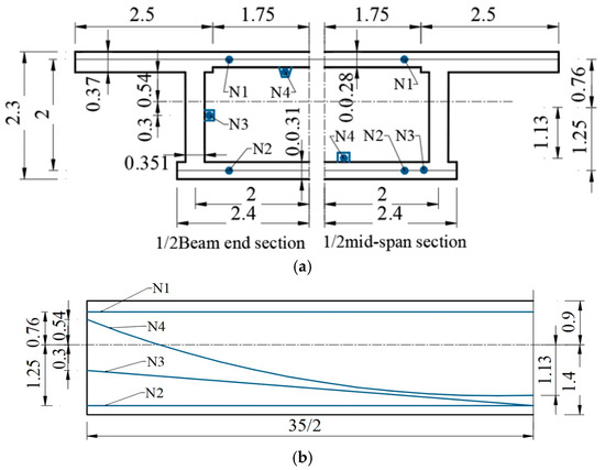 Pre-stressing beam deployment (unit: m). (a) cross-section layout; (b) Arrangement along the beam body.