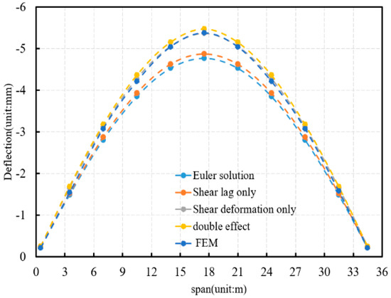 According to Figure 10, it can be seen that the deflection analytical solution of the equivalent beam considering the dual effect and the analytical solution considering only the shear deformation match well with the finite element solution, and the absolute value of the relative error with the finite element solution is within 6.0% and 3.0%, which verifies the reliability of this paper’s computational method. Under the eccentric straight-line beam, the shear deformation does not cause any additional deflection, and the analytical solution considering only shear hysteresis is closer to the finite element solution. Under the in-span folded-line and the in-span curve beam, the analytical solution of deflection considering the dual effect is higher than the finite element solution, and the analytical solution considering only the shear deformation is in better agreement with the finite element solution. The reason for this is related to the type of cell selected for finite element modeling.