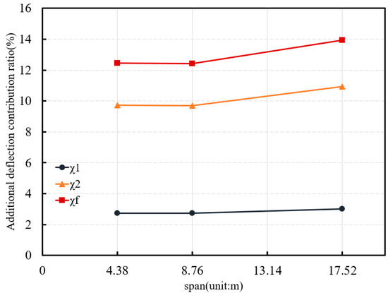 Table 2 provides the total deflection of the mid-span section; primary beam deflection; and , , under different linear individual bundles. From Table 2, it can be seen that under the eccentric straight-line fabrication, the shear deformation does not contribute to the deflection, and the shear lag effect contributes only 0.05%, which is negligible. Under the in-span bending-line and in-span curve fabric bundle, is greater than 10%, while is less than 4%, and is more than 14%. The degree of shear deformation on the deflection is higher than the shear lag effect, and the dual effect on the deflection is not negligible; if only the shear deformation or shear lag effect is taken into consideration in the calculations, the value of the upward deflection caused by pre-stressing will be underestimated to varying degrees.