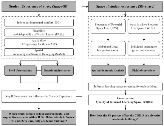 Addressing these critical knowledge gaps, this study adopts a dual-perspective analytical framework. Firstly, from a space-to-user perspective (“space–student experience”, space–SE), the research explores how multi-domain indoor environmental elements and supportive factors within informal learning spaces jointly contribute to shaping student experience. This involves not only conventional indoor environmental elements but also factors such as spatial openness, functional flexibility, learning atmosphere, and the provision of supportive facilities. Secondly, adopting a user-to-space perspective (“student experience–space”, SE–space), the research investigates how student usage patterns—including frequency and modes of use (e.g., individual versus collaborative, planned versus spontaneous)—reciprocally influence perceptions of space quality and effectiveness. This reciprocal approach provides a robust empirical foundation to rethink informal learning spaces as dynamically interactive entities, rather than passive, static environments.