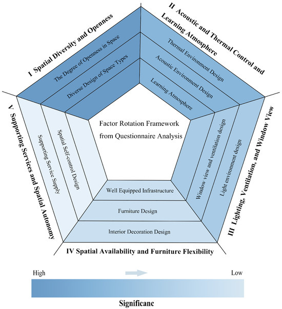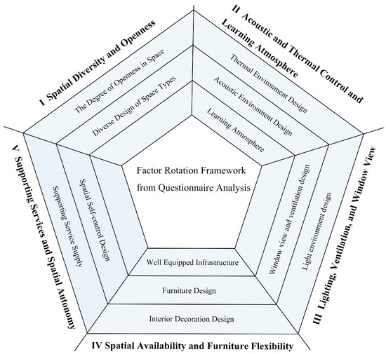 Based on the reclassification of the evaluation elements into five dimensions, the following names were assigned to the dimensions affecting SE (see Figure 2): Dimension 1, supporting services and spatial autonomy (SSSA); Dimension 2, spatial availability and furniture flexibility (SAFF); Dimension 3, lighting, ventilation, and window view (LVWV); Dimension 4, acoustic and thermal control and learning atmosphere (ATCLA); and Dimension 5, spatial diversity and openness (SDO).