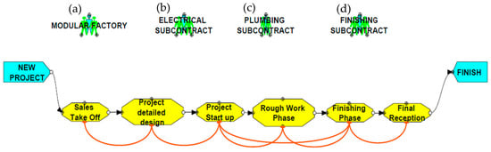 Figure 2 shows the VDT conceptual model of the baseline case. The VDT model is read from top to bottom and left to right. The project organization is at the top (green people icons), and the project process is at the bottom (yellow and turquoise forms). The project organization is divided into four project teams (a) modular factory, (b) electrical, (c) plumbing, and (d) finishing subcontracts. The modular company, which is formed by the company’s professionals, is structured into functional departments: commercial, planning, engineering, supply chain, and production. The electrical (a), plumbing (b), and finishing (c) subcontractors are involved in the manufacturing process (rough work and finishing phases) and organized by a linear structure. The project process comprises two milestones (new project and finish) and six phases divided into two groups (yellow forms): design phases (sales takeoff, project detailed design, and project startup) and manufacturing phases (rough work, finishing, and final reception), and two milestones (new project and finish). The phases are connected by successor relationships (black arrow) and orange links that show the connection among tasks of the phases.