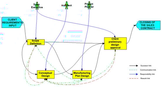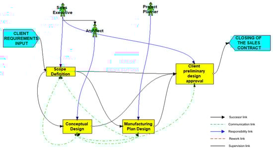 - Phase 1: Sales Takeoff (Figure 3): The project process starts with the commercial process in the Sales Takeoff phase (a). The client defines its project requirements with the sales executive during this process. Then, the architect and project planner work separately on conceptual design and preliminary technical specifications. This phase ends when the client approves the preliminary design. In this phase, it is highlighted that the client’s approval of the preliminary design negatively impacts scope definition and conceptual design tasks due to the corrective iterations generated during this phase.