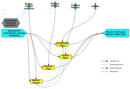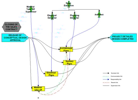 Inside the VDT model, each phase has its own organization and process. The VDT model’s symbols and links are interpreted as follows: The project organization is defined by the relationship between positions that participate in the development of processes. These positions are linked to each other with supervision links (black line). This link defines which position (group or individual) would go for information or to report an exception (e.g., design change, error detected) [17]. Positions are also linked to processes with blue assignment links, which means which position is responsible for which task.