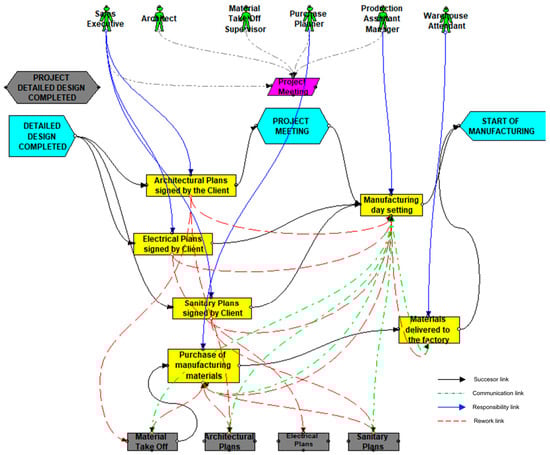 - Phase 3: Project Startup (Figure 5): Then, in the project startup, the participants prepare the final plans (architectural, electrical, and sanitary), which are submitted for the client’s approval and subsequently released as “approved plans for construction.” To accomplish this project goal, the sales executive, architect, material takeoff supervisor, purchase planner, warehouse attendant, and production assistant manager participate in the “project meeting.” In this meeting, they make decisions and define the approved plans for construction. The manufacturing day setting task is connected with rework links to all other tasks in this phase. This task is also connected with communication links with tasks from Phase 2 (gray rectangles). All tasks are connected with rework links to tasks from Phase 2. In this phase, the purchase planner works on the tasks of purchasing manufacturing materials and their delivery to the factory.