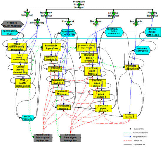 - Phase 4: Rough Work (Figure 6): Based on these approved plans, the production assistant manager coordinates with wood, framework, electrical, and plumbing supervisors on the rough work phase. The process focuses on the fabrication of modules. This phase comprises four main milestones: framework, electrical pipes, plumbing, and rough work. All framework, electrical, and plumbing-related tasks are connected with rework links, including architectural and electrical plans signed by the client from Phase 3 (gray rectangles). The communication links are only present at the level of supervision tasks.