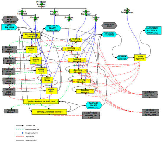 - Phase 5: Finishing (Figure 7): The process focuses on installing electrical and sanitary appliances and finishing, and ends with the quality approval task. The production assistant manager coordinates with electrical, plumbing, and finishing supervisors on the finishing phase. This phase has four main milestones: electrical, sanitary, fabrication, and quality control. All electrical tasks are connected to electrical tasks from Phase 4 (gray rectangles), and electrical plans signed by the client from Phase 3 (gray rectangles) with rework links. Finishing tasks are also connected to architectural plans signed by the client from Phase 3, with rework links. The quality approval task is connected to electrical and finishing tasks using rework links. The communication links are only present at the level of supervision tasks. The final product of this phase is the fabrication.