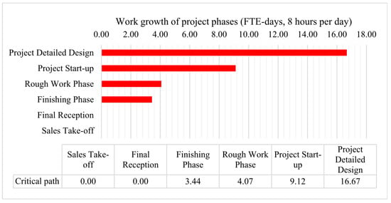 The authors make a detailed analysis in SimVision to understand which phases have the highest incidence in the simulated duration; that is, it has a significant schedule growth risk larger than 4 days. According to the simulation results (Figure 9), the phases with significant schedule growth risk are project detailed design (9.12 days) and project startup (16.6 days). Then, the detailed analysis of the scheduled growth risk of the project’s detailed design reveals that the architectural plans have the greatest growth risk. Meanwhile, in project startup, the purchase of manufacturing materials has the highest growth risk.