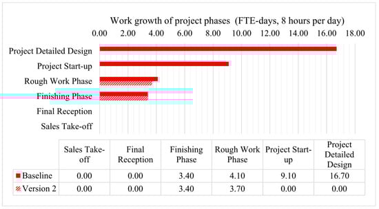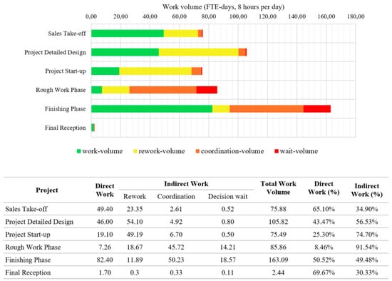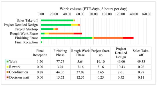 According to the SimVision results of the modified VDT model, the analysis of the work volume shows that the sales takeoff and finishing phases continue with the longer direct work volume. On the other hand, rough work, project startup, project detailed design, and finishing phases also continue with the highest percentage of indirect work (rework, coordination, and wait volume). However, the rework volume was reduced significantly in the indirect work of project startup and project detailed design (10.43 and 3.16, respectively). Meanwhile, the rough work and finishing phases have a reduction in the coordination (37.02 and 44.05, respectively) and wait volume (12.55 and 15.72, respectively) (Figure 15).